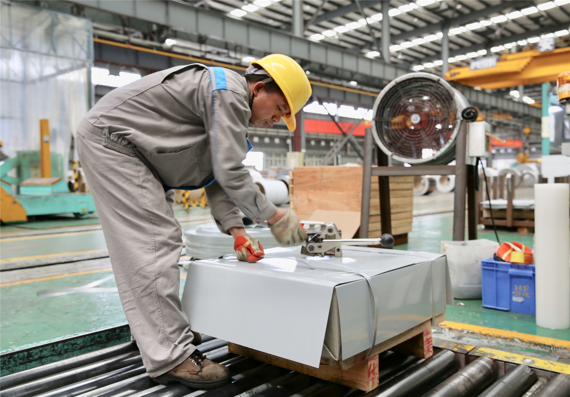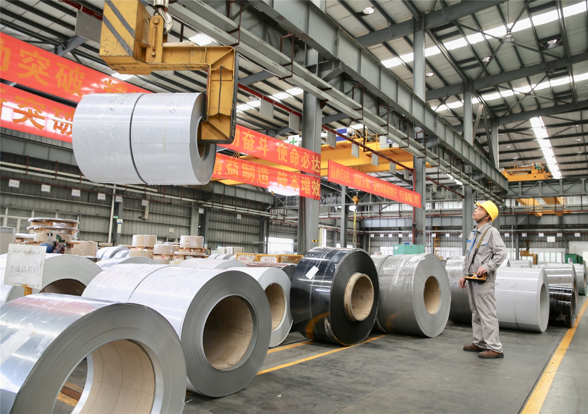 ▲ 車間掛(guà)著部門的(de)誓師口號,一(yī)名員工(gōng)在搬運紮卷